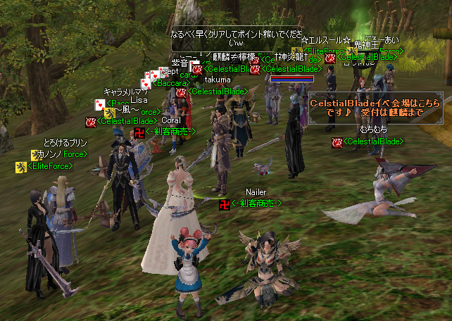 イベントページ 麒麟さんと当日うちのメンバーだけとかだったら凹むね・・・ などと話していたのですが 沢山の方に参加してもらい おお!(||゚Д゚)と逆にアタフタしました・・・・ 参加者 †神炎龍†(司会) ・ 麒麟≠檸檬さん(司会) ウィスクさん ・ 風さん ・ うずまき猫さん ・ 鬼神王さん ・ takumaさん Coralさん ・ Nailerさん キアロさん ・ キャラメルマンさん ・ ⅠブッチャーⅠさん ・ 紫音さん Septさん ・ Altairさん ICHIさん ・ ♂ゅぅゅぅ♀さん(見学) ☆エルスール☆さん ・ カノンノさん ・ Lisaさん ・ ぶるーあいさん とろけるプリンさん(見学) ・ Kaoruun2さん(見学) 18人の方の参加で参加費も18M集まり、 麒麟さん自腹プラスで優勝賞金20Mとなりましたw 1時間皆さんには走り回ってもらい、わいわいがやがやと出来てよかったですw 結果ですが、